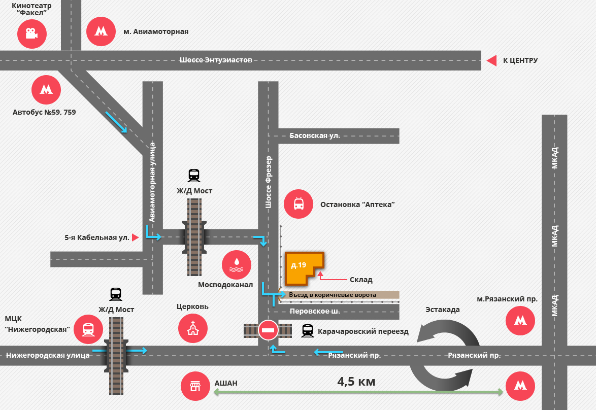 Общественным транспортом От метро Авиамоторная: После выхода из стеклянных дверей метро идти до конца самого длинного туннеля подземного перехода, подняться на выход прямо - к автобусной остановке. Автобусы № 59 или 759, 859, маршрутное такси № 133 «Карачарово» ехать до остановки «Аптека» (5-я по счету). Далее в обратную сторону пешком по левой стороне. Сразу за автобусной остановкой - открытые ворота. От метро Рязанский проспект: Троллейбус или маршрутка №63, автобус № 143 в сторону центра, а так же любой транспорт, идущий до магазина «Ашан». Остановка «Ашан», идти в обратную сторону, поворот налево за церковью, пройти через ж/д переезд. Перейти на правую сторону улицы, далее вдоль забора до коричневых ворот. От ж/д станции Фрезер: От станции на любом транспорте в сторону Карачаровского ж/д переезда. Остановка «Аптека» По левой стороне улицы вдоль бетонного забора. Около автобусной остановки - открытые ворота. От станции Карачарово (пешком):